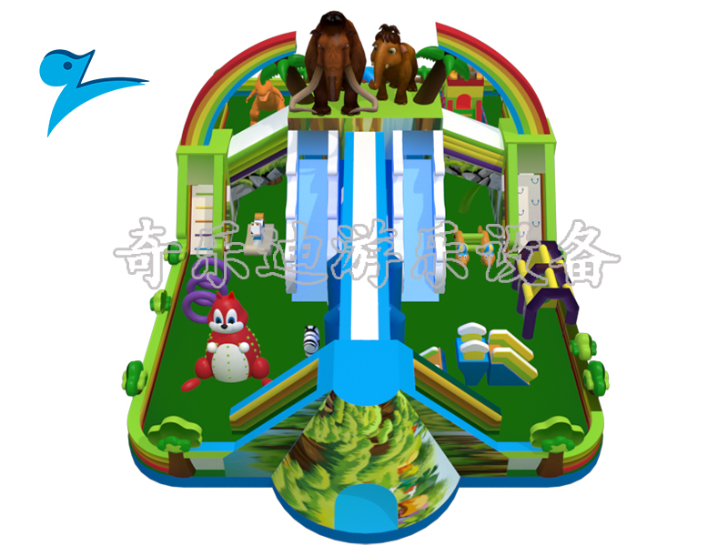 儿童游乐设备猛犸象是一款无动力充气项目,从它的新颖造型上来说,别出心裁的选用侏罗纪时期一大霸主猛犸象作为主要元素,同时再配以小朋友们都喜欢的可爱松鼠、繁茂的树木作为点缀,充分贴合孩子们心理的设计自然是更受小小游客的欢迎了!不仅如此选用大自然绿色作为主色调,再搭配以红色、紫色、蓝色等穿插让人一眼看去就非常舒服。