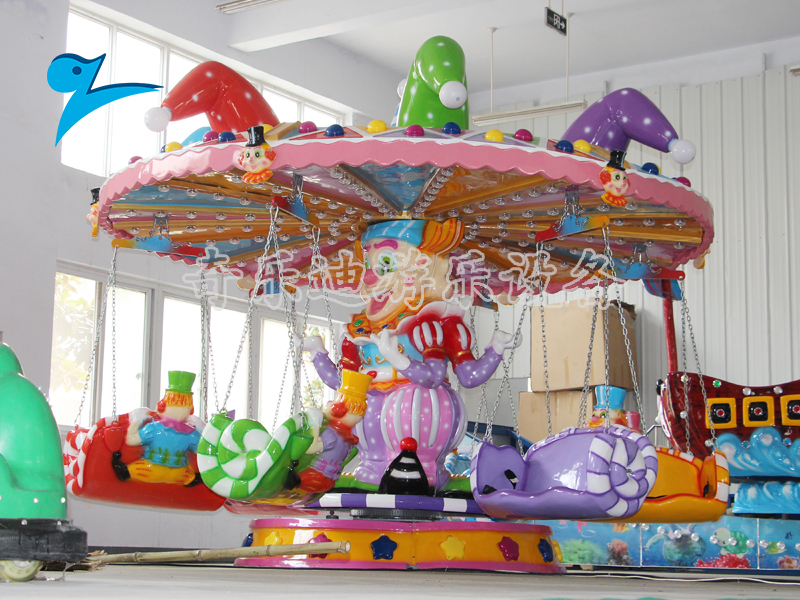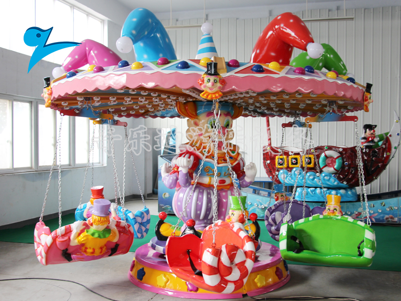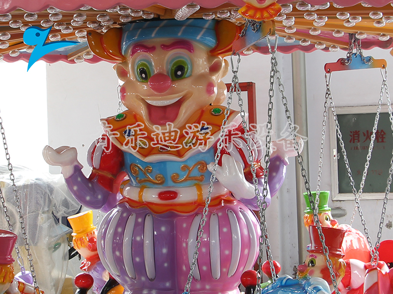 小丑飞椅造型相对比较小,就是在飞椅系列产品中都算小型设备了,但是做工非常精细,整机中心部位是钢结构,其他大部分地区都是玻璃钢,特别的造型,外加汽车工艺的喷漆效果,整体形象生动、逼真,并且玻璃钢上镶嵌了非常多的灯光,运行的时候其效果非常不错,小朋友乘坐其中好似置身于马戏团中。在运行时,此款游乐设备定向缓慢旋转,小朋友乘坐其中就好似荡秋千,并且每一个座舱上都有安全带,所以安全系数特别高,再加上家长也可以一起乘坐,所以安全方面不用担心。