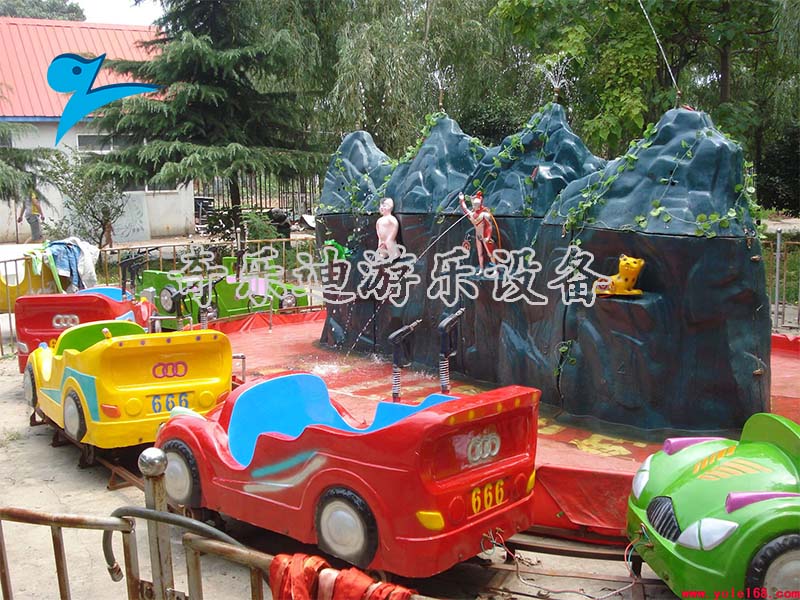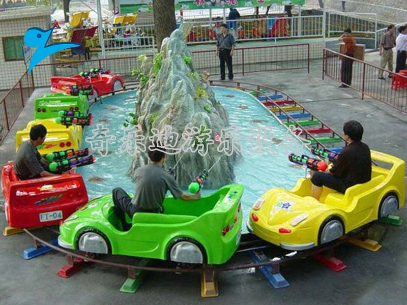 水路战车是一款好玩的水上轨道类游乐设备,它主要是由轨道、水池、假山还有多种卡通式的动物装饰等几部分组成,生动逼真的造型与鲜艳的色彩搭配成功吸引了不少孩子们的目光。在它的玩法设计上,游客乘坐在座舱当中围绕椭圆形的轨道做定向的旋转,它在每辆战车上都配置有两把水枪,孩子们扣动扳机水柱直射到假山上的动物身上,动物受到感应发出逼真的叫声,从口中喷出水柱非常刺激好玩。