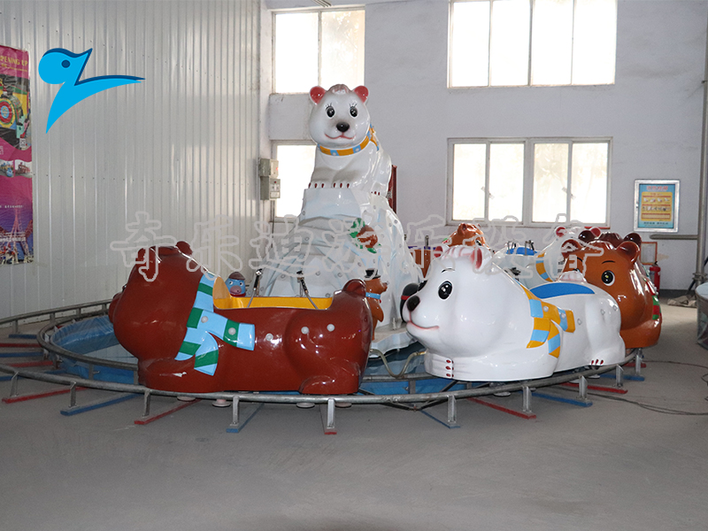 儿童游乐设备,因为该款游乐项目针对的主要群体就是中小型的孩子,所以在它的设计风格上选用孩子们所熟知的北极熊、企鹅等动物作为原型,卡通的表现手法让小动物显得憨态可掬更受游客们的欢迎。在这款轨道类的儿童游乐项目当中,大胆选用白色与棕色的卡通熊颜色搭配,带给孩子们视觉享受的同时在诸多游乐项目当中更加出众。