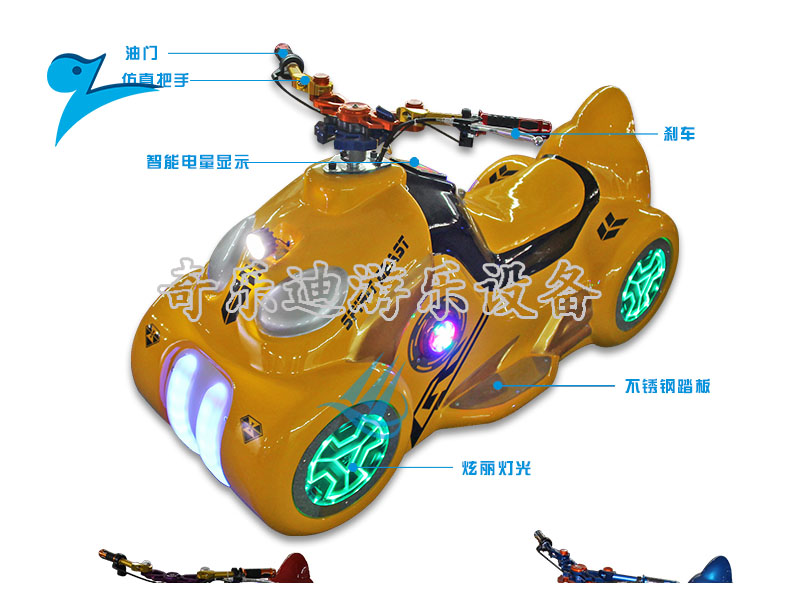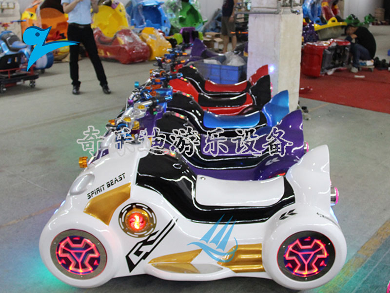 游乐设施,它充满流线感的车身造型与弧线车座,同时加上不锈钢反光车轮使整个造型十分炫酷。绚丽的彩灯设置,轻松营造高人气的经营氛围,在夜晚的时候成为全场的焦点。动感的音响效果让乘坐其中的游客热血沸腾,很大程度上刺激了围观游客的加入。从投资者的角度来说,遥控启动模式让后续的经营更加省心省力。
