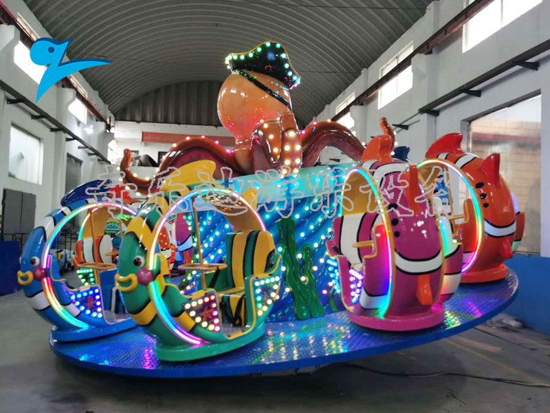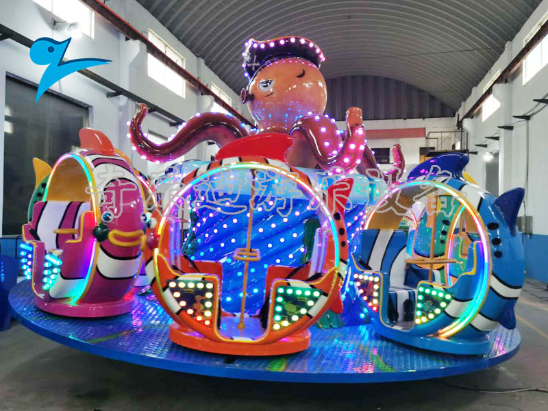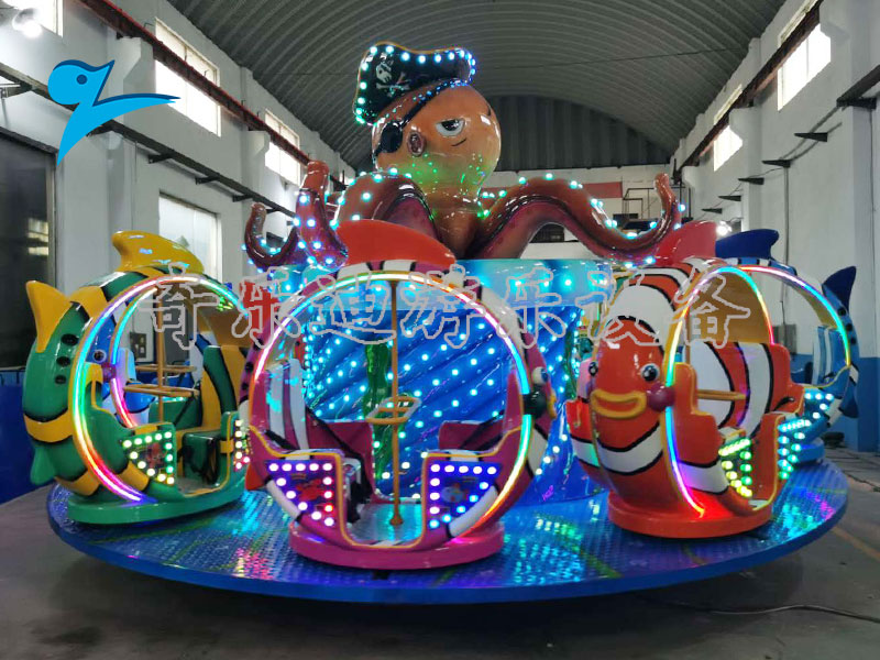 从梦幻章鱼的玩法上来说也是做到了创新,在这款充满童趣的大章鱼四周,分布着颜色各异的小鱼座舱,在设备运行的时候除了底盘的公转之外,每一个座舱还能做自转的运动,双重的旋转体验带给游客眩晕的体验。游客乘坐在新型游乐设备当中,在大章鱼和座舱周边灯光的环绕下,仿佛置身大海深处,来一场神秘的海底世界之旅。