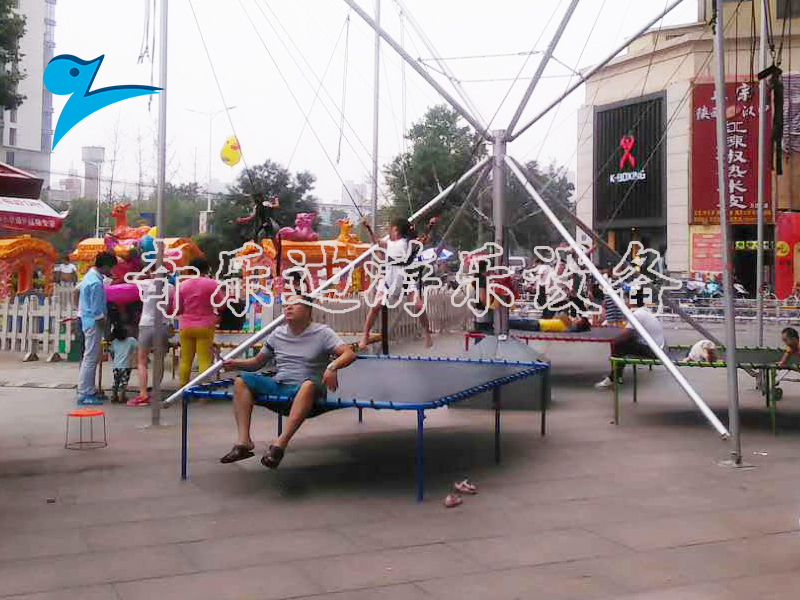 从投资者的角度来说,四人蹦极无需前期繁琐的安装环节,便于灵活经营便于拆卸维修,它的整个经营更是省心省力。孩子们系好安全带就可以在跳床与弹力绳的作用下,在4米的高空当中轻易的实现各种花样的翻转,领略到腾飞的乐趣,欢乐自由的乘坐体验当然是更受孩子们的欢迎了。但是要注意的一点是,蹦极跳床儿童游乐设备要在公园、休闲性广场、步行街等没有车流的地方使用。
