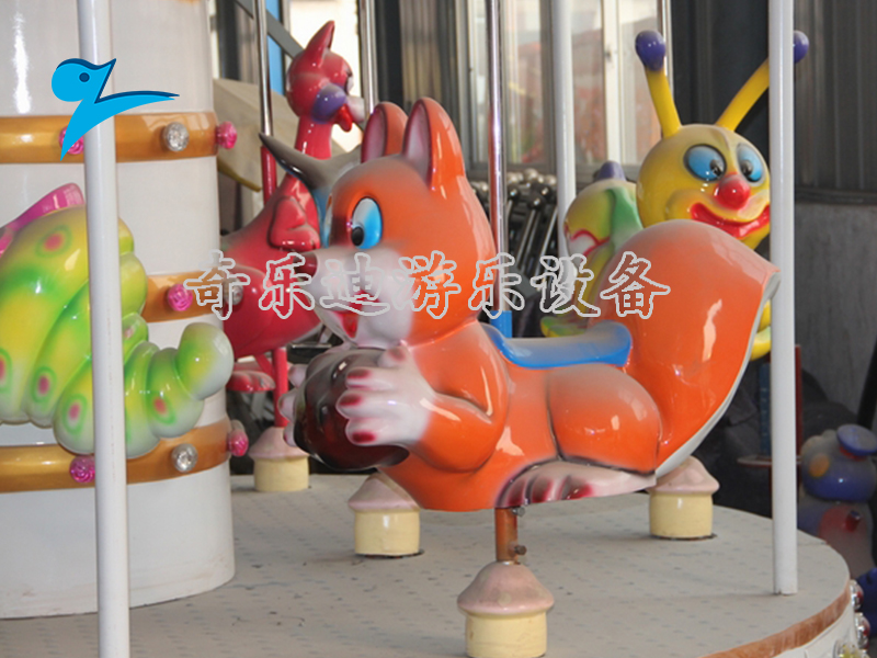 游乐设施,它的设计参考森林当中常见的梅花鹿、松鼠、毛毛虫等动物原型,通过卡通式的处理替代常规的骏马座舱,生动活泼的外观设计让喜欢亲近自然的小朋友非常喜欢。整个设备一共配置有9个座舱,均匀围绕中心轴以圆形排列,在它的顶棚设计上参考欧式皇冠,给人一种尊贵的浓郁风格,一圆孩子们童年的公主王子梦。