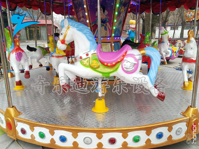 从12座豪华转马的运行方式上来看,它与转马类游乐设备相同,都是围绕中心轴做定向的旋转,在设备启动之后,马匹造型的座舱进行上下起伏式的摆动。一般来说豪华转马的运行速度都不是很快,所以对游客的乘坐年龄没有太大的限制,也正是如此它更为适合家庭式亲子互动体验和情侣之间乘坐。在夜晚的时候,多色彩灯的闪烁不仅能够吸引来更多的客户,更是为游客的乘坐体验增添了不少的欢乐。