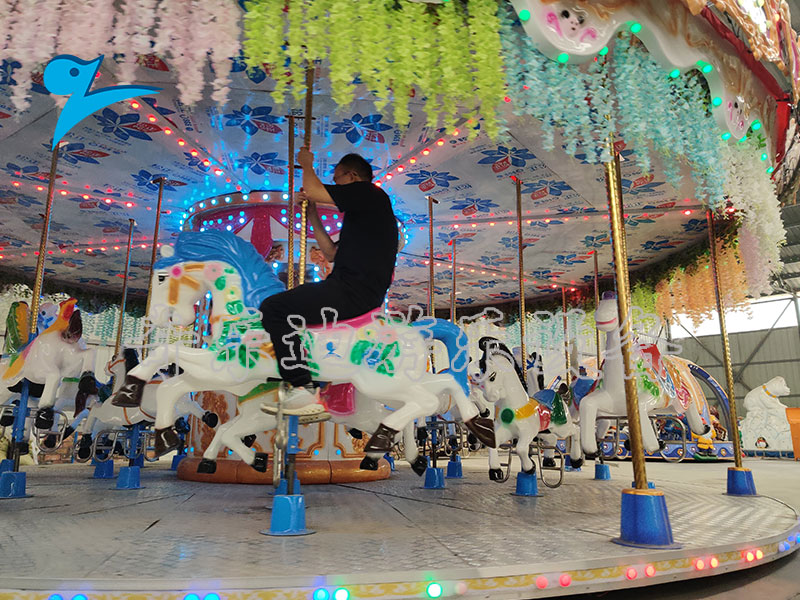 24座豪华转马游乐设施的运行方式与其他转马类设备大致相同,通过围绕中心轴做定向的旋转,在设备启动之后匀速转动,形态各异的马匹上下起伏,真的就像乘坐在骏马身上驰骋疆场一样。无论各个年龄段的游客,在看到豪华转马的时候,总是忍不住想要乘坐体验一番,从它的商业价值上考虑,它适合摆放在公园、商场、少年宫等人流量密集的场所。
