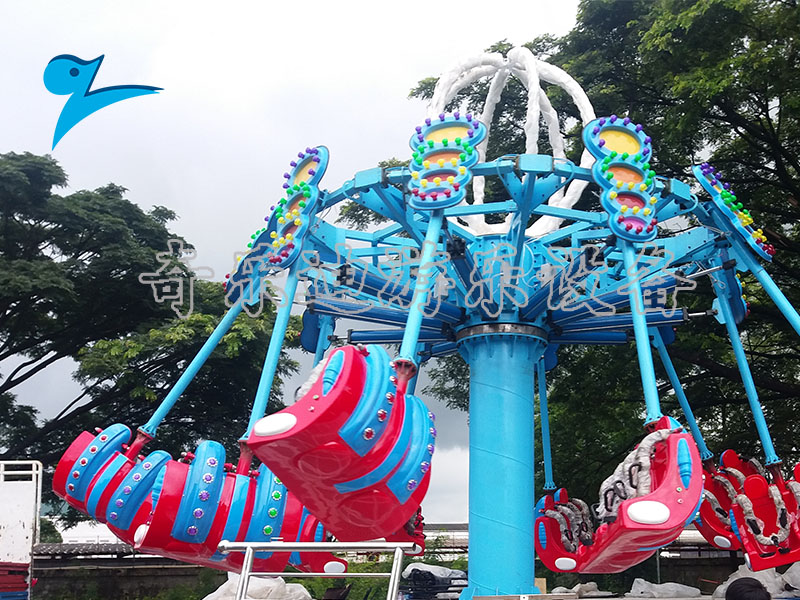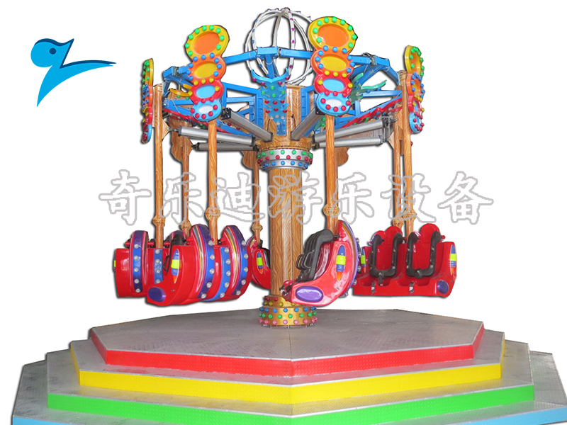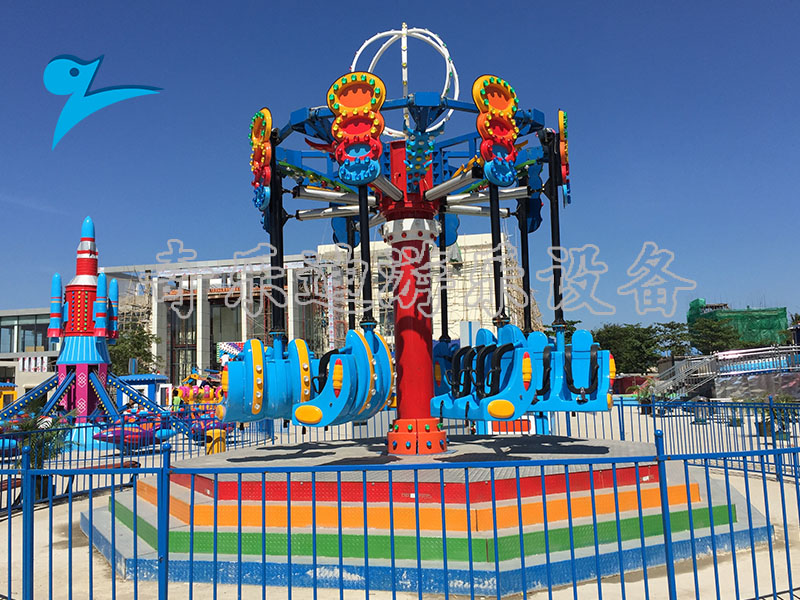 游乐设施,它的外形看起来与飞椅有些类似,但是它的玩法可是与之大不相同。明亮的蓝色与轻快的黄色相搭配,再加上一些卡通元素的装饰,让这款设备在游乐园当中成为焦点般的存在。它除了拥有飞椅的旋转功能之外,还可以通过气缸起到座舱升降的作用。其有富动感的外观,华丽的灯光效果,在夜晚的时候耀眼夺目,游客们乘坐其中体会到乐趣。