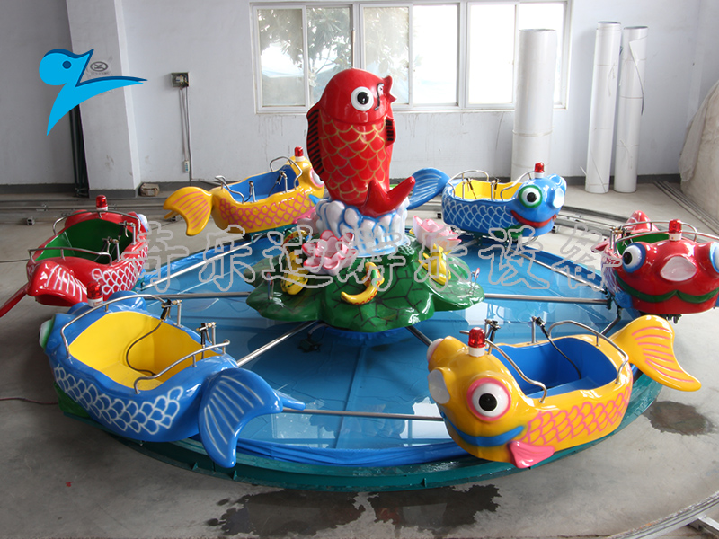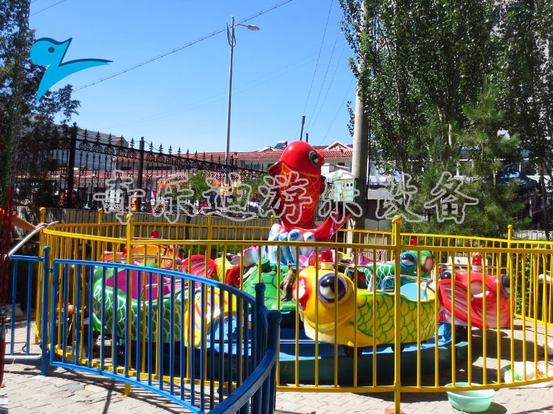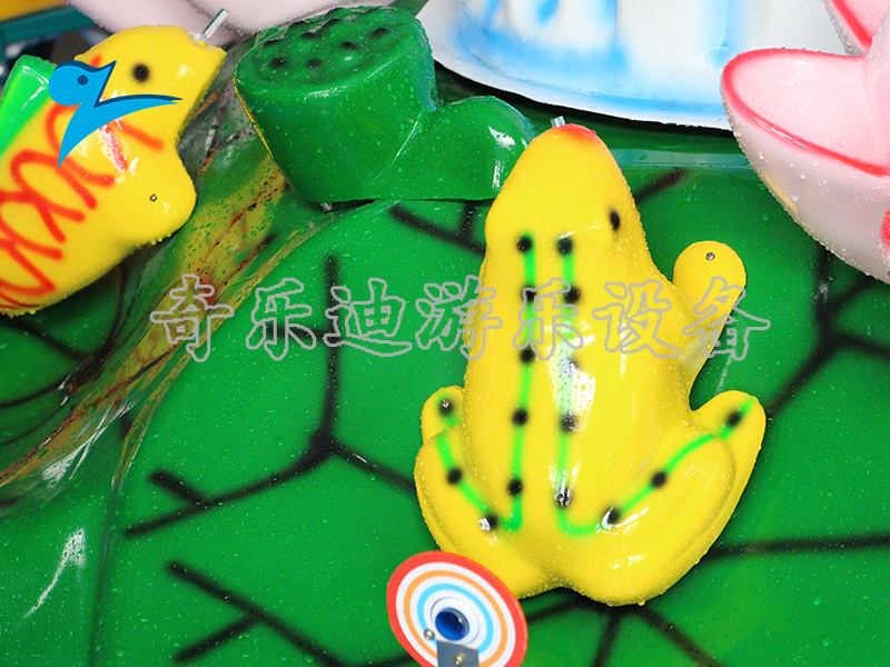 鲤鱼跳龙门的玩法也是十分有趣的,游客们坐在鲤鱼造型的座舱当中定向旋转,它的中心是跃上云朵的鲤鱼造型,配合四周荷叶、小鱼、青蛙等多种动植物造型,更是增添了几分的童趣。在前追后赶的旋转当中,孩子们可以通过手中的水枪打在小动物的身上,小动物们向孩子喷水并发出叫喊,生动逼真的细节化设计让孩子们大声欢笑。在冬天的时候,投资者可以将水枪换成激光枪,一年四季都可经营没有季节性的限制。