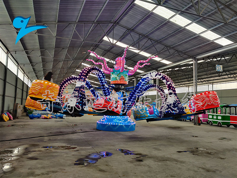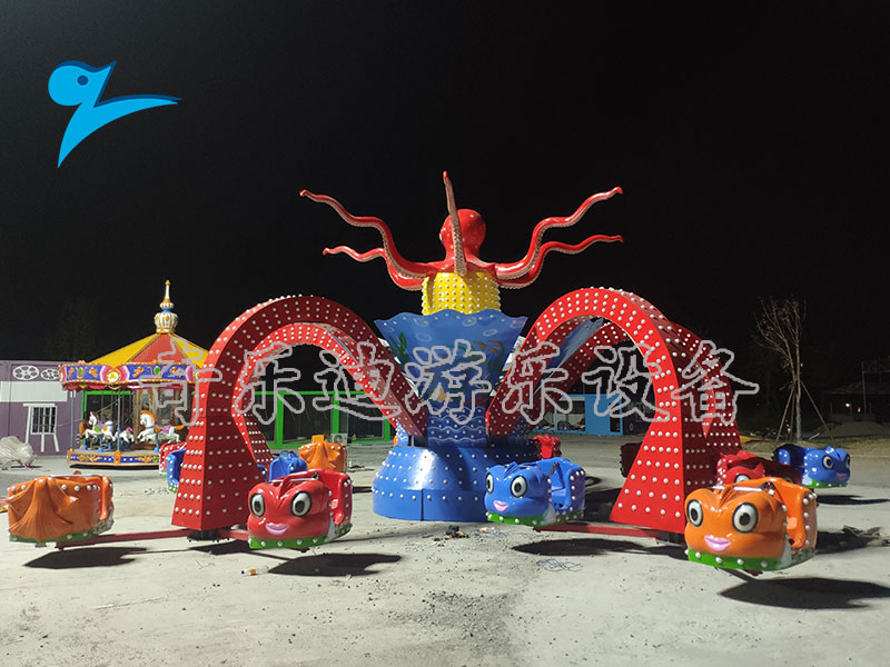 游乐设施,从它的整个设计上来看选用大海当中的神秘章鱼作为主题形象,大大的章鱼伸出长长的手臂,游客坐在卡通小鱼的座舱当中旋转飞舞、上下起伏、忽快忽慢的速度为游客带来一场疯狂刺激的海洋之旅。不仅如此炫丽的灯光设计与动感的音效结合,更是失去了大章鱼可怕的本性,增添了产品的娱乐性和趣味性。